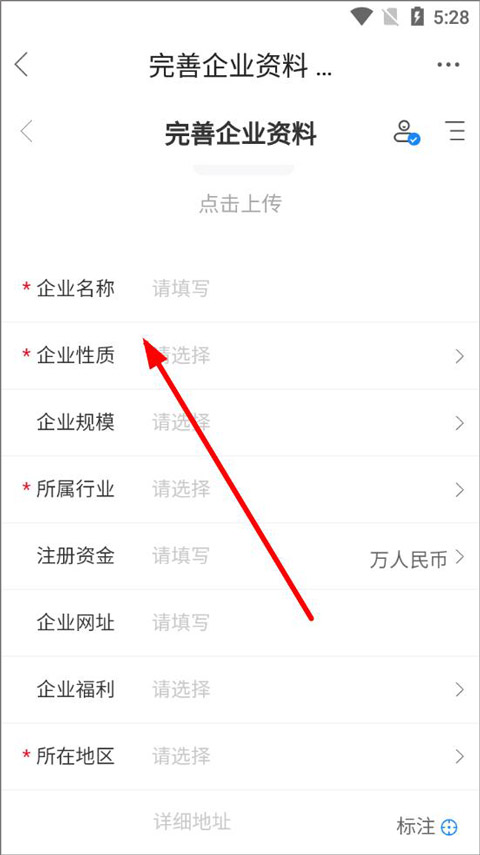 3、登录后完善企业资料,包括企业姓名、性质、规模、所属行业等基本信息;