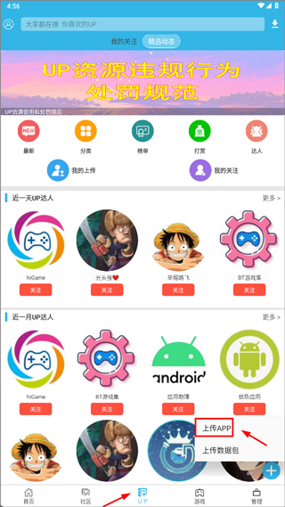 1、进入app后,点击下方“UP”,然后点击右侧+号,选择上传APP;