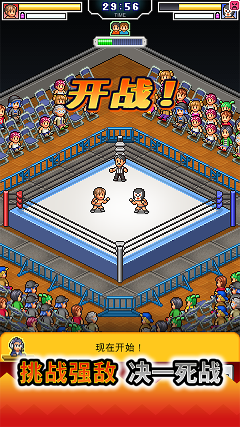 1、经典视觉风格:延续开罗游戏标志性的像素画风,角色造型夸张生动,擂台场景细节丰富(如观众席、灯光效果),营造出怀旧与幽默并存的氛围。