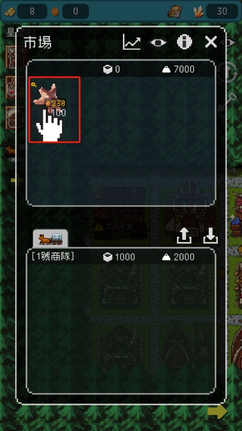 3、建造完商会后需要进入货物来售卖,点击市场购买1号商品吧。