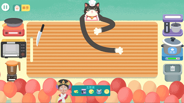 这款游戏《喵喵小厨娘》看起来超级有趣!主角是一只爱 cooking 的猫,长着一副搞笑的长手臂,操作起来滑稽又可爱。玩法主要是经营餐厅,用猫爪切菜、炒菜,还能遇到各种搞怪角色,比如甄嬛和猪八戒,真是让人忍俊不禁。