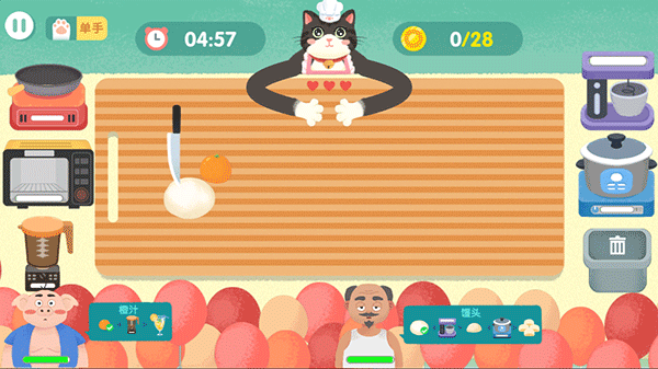喵喵小厨娘是一款以猫咪厨师为主视角的模拟经营的游戏,猫咪长长的手臂看起来非常的滑稽,玩家在游戏中需要操控猫咪完成烹饪经营餐厅等,两只猫爪各有操控方式,关卡难度由简到难,如果速度还可能会遭到顾客的差评哦。并且游戏中除了制作各具特色的菜品,还能遇到各种搞怪客人。