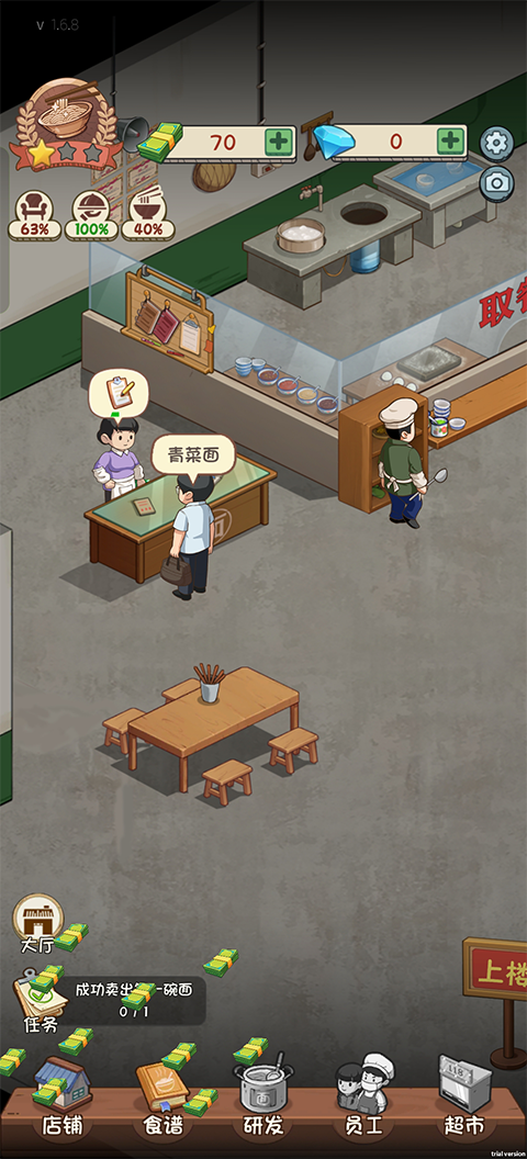 1、扩展你的面馆帝国,随着游戏进程推出各种新菜品和服务。