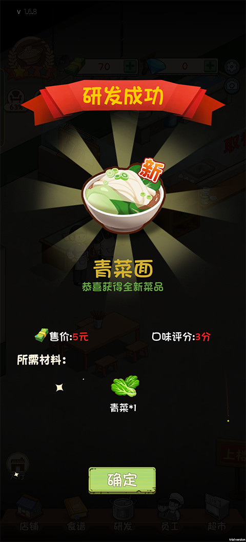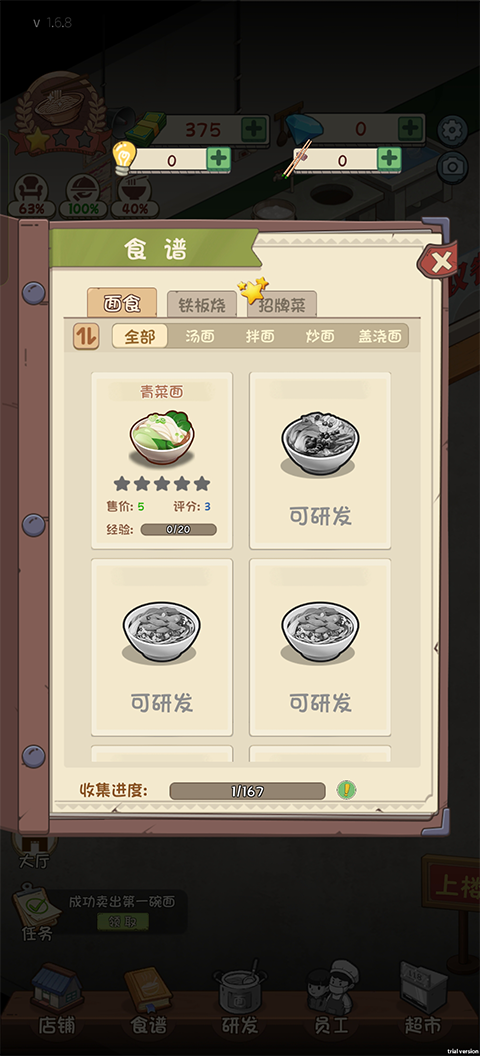 3、店铺经营:接待顾客、制作面条、结账收银,完成日常任务赚收益。反复制作提升熟练度,可一键快速出餐。自由装修店铺,升级设备扩大规模。