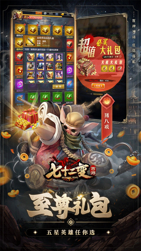 《西游七十二变》是一款以《西游记》为背景的竖版放置挂机手游,画面精美,音效配乐古典,战斗特效全屏呈现,带感十足。玩家化身孙悟空,通过组合技能挑战各种妖魔,解锁多个经典副本章节,体验齐天大圣的成长之路。