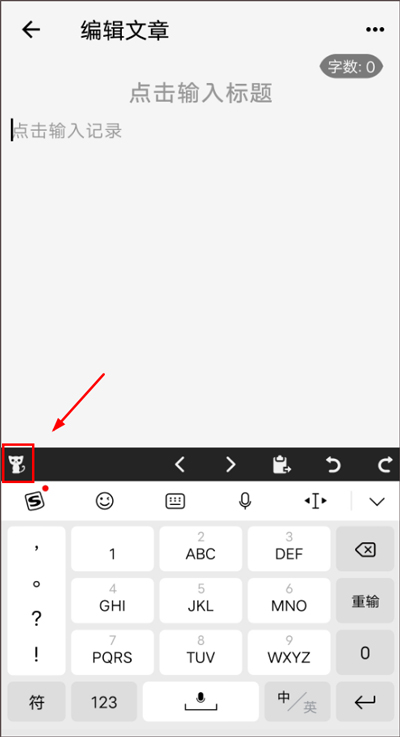 2、App默认开启Markdown即使【所见即所得模式】。但用户想切换成其他模式,在编辑页面出现键盘是,点击上面的工具栏上左边小猫;
