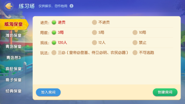 除此之外,多乐保皇游戏还针对山东不同地区开设了不同玩法,比如威海保皇、潍坊保皇、青岛保皇以及癞子保皇等等,各位可根据自己的喜好来选择对应的玩法进入,同时针对新手朋友开设了练习场和单机场,在这里熟悉玩法之后再去和其他人一较高下,有兴趣的小伙伴可以来下载体验。