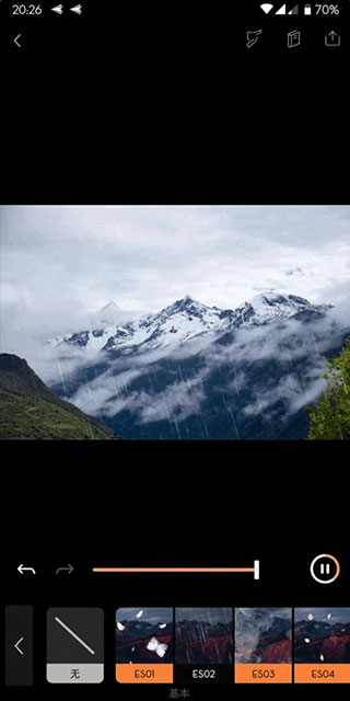 接下来我们让画面多一分「山中细雨,润物无声」的意境。我们可以在「覆层」中选择「细雨」的特效,并调节效果的强弱度,避免特效太过明显而喧宾夺主。