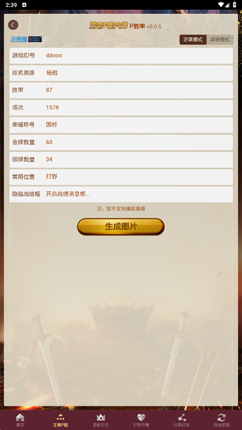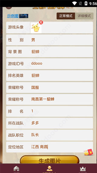 软件提供两种模式:正常模式和高级模式,区别在于信息的详细程度。你可以随意编辑游戏ID、排名英雄、荣耀称号、战队信息、头像框、贵族级别等内容,制作完成后还能保存到本地并分享给好友,操作简单又方便。