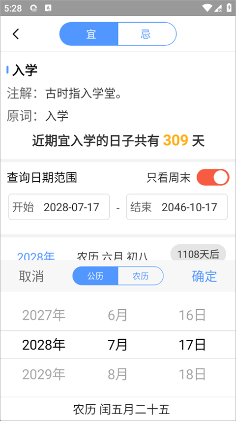3、等待页面刷新并显示吉日日期,你还可以调整查询日期的范围。