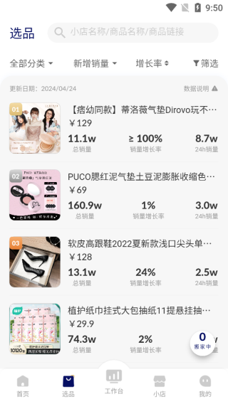 3、选品专区可以查看到各类商品的销量增长率,帮助用户掌握市场;