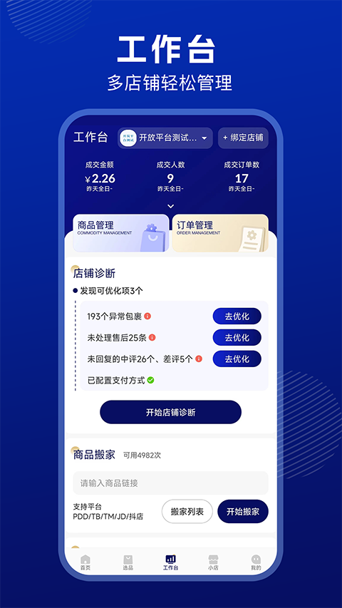 4、工作台需先绑定自己的店铺,帮助管理自己的店铺;