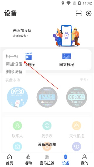 1、在本站下载安装好Wearinos官方版,运行软件点击设备页面,然后点击上方的“为添加设备,去连接设备”