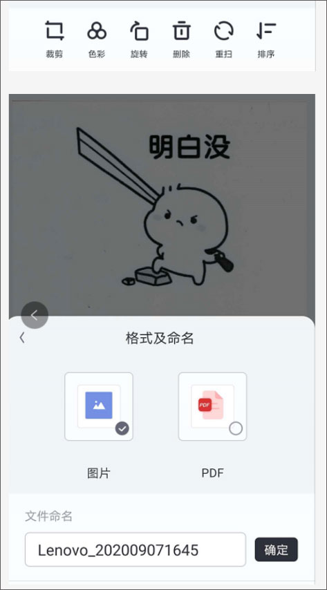 4、点击“完成”后,出现编辑界面,您可以在此界面对扫描件进行剪切、涂色及旋转等简单排版操作;点击“完成”后出现保存界面,您可以选择保存为图片格式或PDF格式的文件,并可以在下方设置文件名称,点击“确定”进行保存。