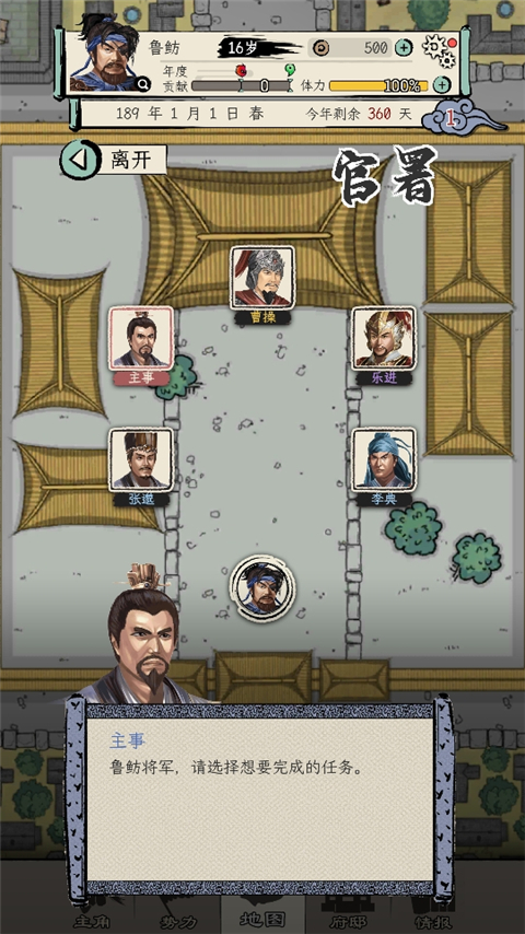 5、同僚篇1:本游戏最重要的之一,没同僚游戏没法玩。要求同势力武将友好60,官邸对话给需求就可以加入了。做任务时候可以出列帮忙,5品演义必须1任务3同僚才能完成。当太守时候可以选择每年将你的同僚拉到你的城帮忙。