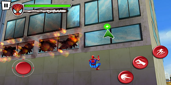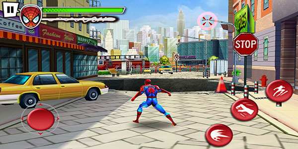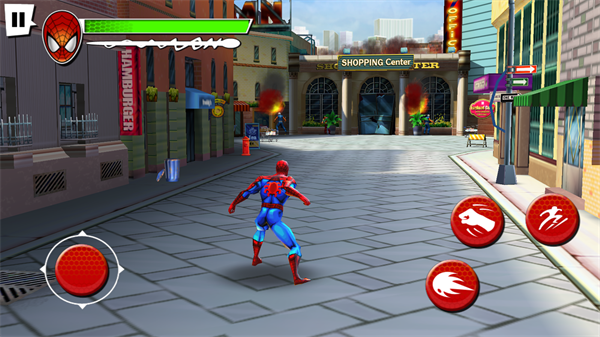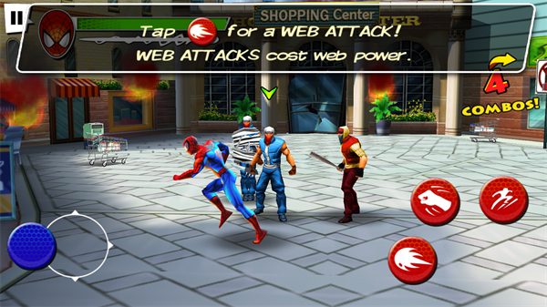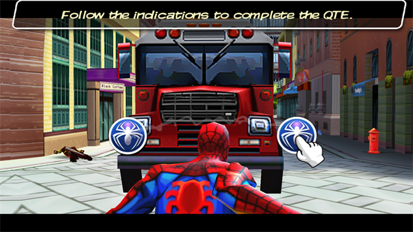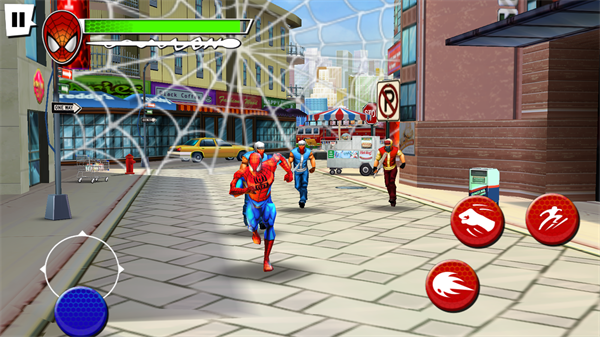 战斗节奏紧凑,玩家可通过组合虚拟摇杆与按键实现快节奏连招。连击系统鼓励持续攻击,积累积分可兑换蜘蛛战衣或技能升级,同时支持QTE(快速反应事件)触发华丽招式,提升操作爽快感。