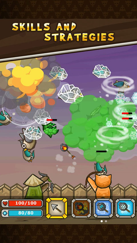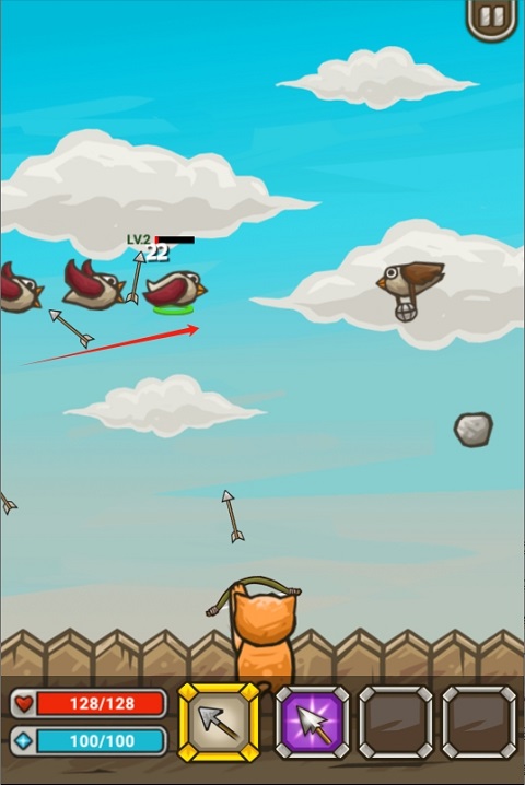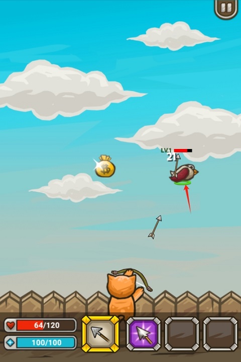 《猫射手》是一款以猫咪为主角的射击小游戏,玩家需要帮助村庄对抗被诅咒的鸟儿们。游戏操作简单,点击小鸟就能发射弓箭,还能滑动屏幕调整方向。通关后能获得经验和金币,升级后可以分配技能点强化自己。游戏的敌人会越来越强,所以得不断换装备和武器。