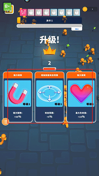 1、在游戏中你必须在无数关卡中击败敌人,而在固定关卡中,你可以选择不同的技能,因此你可以匹配正确的技能,在众多敌人中生存。