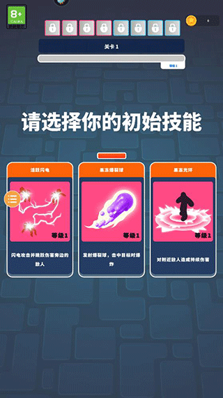 1、进入游戏就可以选择一个技能,后面每升一级都可以再选择一个。注意,选择同样的两个技能不会多占一个技能位哦。
