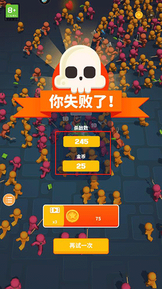 8、如果血量全部用尽,游戏失败,就结算游戏杀敌数和收集的金币奖励。