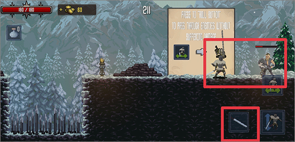 1、进入游戏后,左边屏幕操控角色的移动,右边为攻击和跳跃