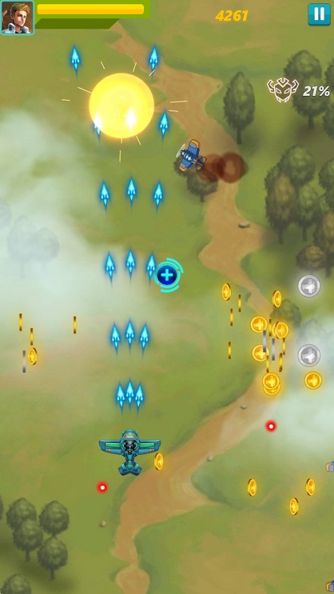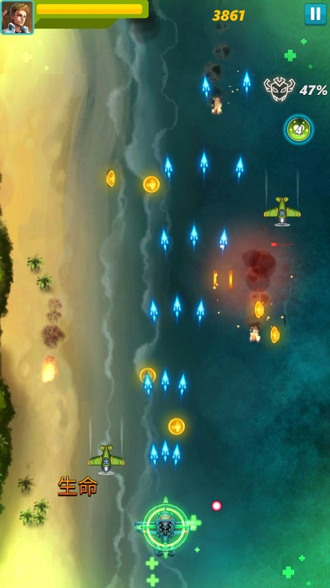 3、打掉敌机会掉落随机道具,拾取道具,可强化战力,还能恢复生命值。