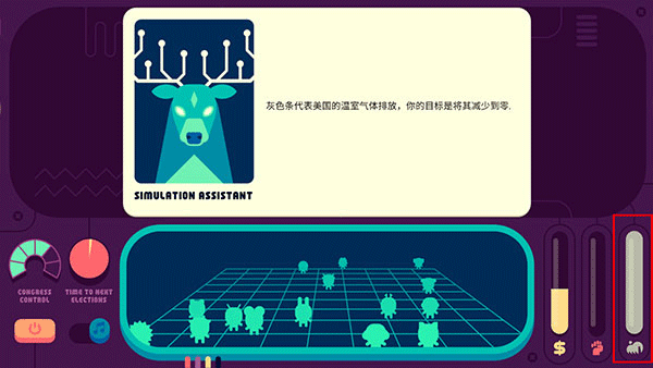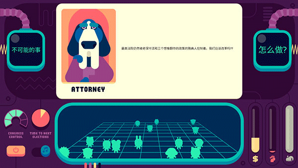 2、中心是关于一些决策问题,需要你来选择,下面的屏幕上是一个选民模型,选民的位置是按照他们的认可度排列的,最靠近的人会在下次选举中投票给你。