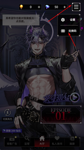 1、首先打开地狱之吻手游,进入游戏后点击右上角菜单按钮,选择兑换码;