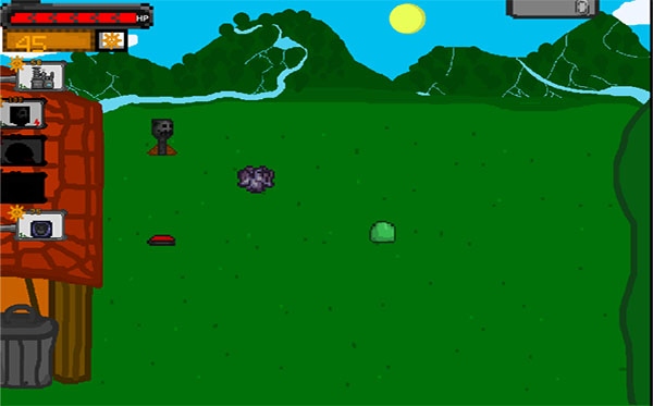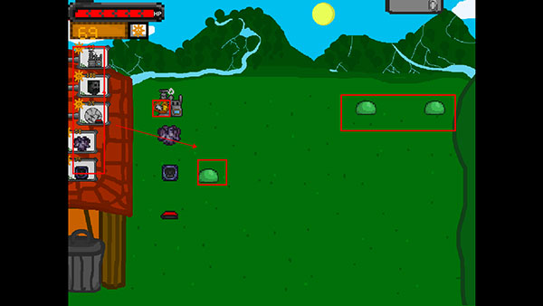 将左边的武器放置到草地上,适当的安排可用材料数,防卫跳来跳去的类似史莱姆的僵尸;