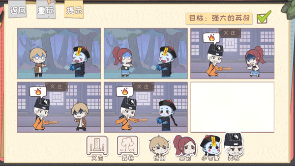 1、游戏内玩家需要将屏幕下方场景、人物拖入画板中,组成与关卡名称所符合的故事情节。