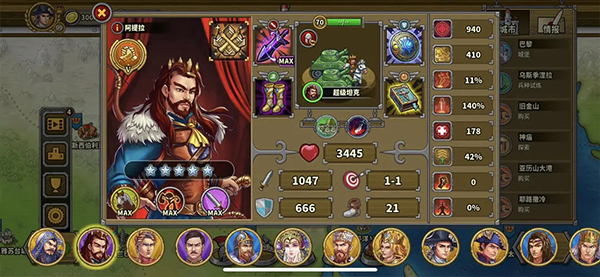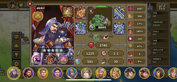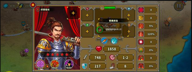 3、接下来是辅助性弓箭手,李鸿章,一技能弓兵指挥官,满级周围全体弓箭手攻击力 50%,光环持续3回合,作用半径2格,配合织田信长攻击力轻松破千,二技能领导力和织田信长一样降低攻击力,前两个升满,三技能防御专家,增加防御力,我没怎么升过。