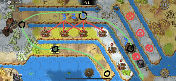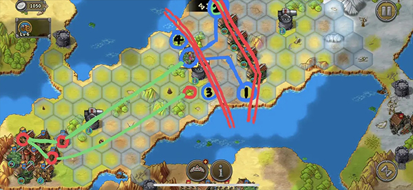 一开始素里育泰下去占经济小屋的时候,放一个50%减费工厂公主。造的第一个炮两步走到下方1号位置堵路,第二个炮两步到上方2号位置堵路,构成第一道防线,拖着不让两个怪下来。一般第一道防线撑两回合,还要再造3号和4号做第二道,再第一道破了的时候补上去。防线前面有空位置,就要不断试着把防线向前推,把怪赶到中间留给炮塔和友军炮用燃烧。同时把怪赶到中间方便下路直上去,不用在下面缠斗浪费回合,也方便到中路集合开指挥集中输出。