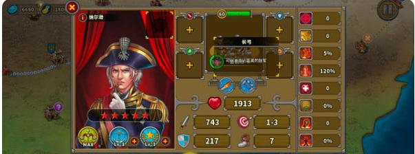 4、纳尔逊,一技能也是弓兵指挥官,升满,二技能航海术,在海上攻击敌军,30%造成混乱,持续两回合,由于欧陆的海战较少,不值得,当热想升级也可以。三技能将军增加生命值,有点亏,李世民是元帅,加的生命值更多。