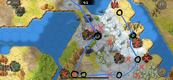 一开始反复刷爆击斩杀木兰,然后再南下,按照黑色圆圈进行站位清兵,红色叉为无名将和小兵,不能斩杀残血也没啥伤害就直接走。在右下角的时候大招就能出来,不要着急立刻用,结合血量在两个红圈用,一般留到第二个红圈直接击杀。中路要用炮来探视野防止被堵路或者上路阿提拉出来的快站在中路偏上的地方吸引兵力防止堆到大汗门口。