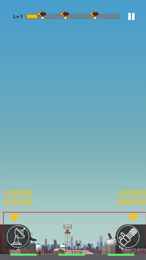 3、一共有三种防御导弹的方式:一种是自动防御,一种是弹幕防御,最后一种是手动防御,手动防御需要点击中间的建筑物才会发射导弹进行防御。