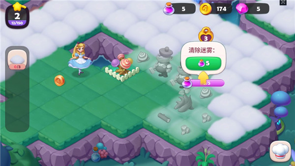 魔法药水则可用来清除云雾,从而解锁新区域。新区域上会获得一些资源,也会存在不可移动的障碍物,需要清除障碍物才可彻底消除云雾。