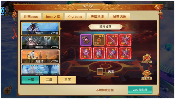 BOSS界面,通过点选BOSS查看奖励信息,已刷新的BOSS点击前往直接进入BOSS战