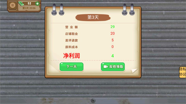 3、玩家接待完当天客人后即游戏结束,可查看当天小卖部的营业额、退款、净利润等;