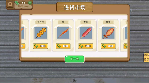 4、如果玩家还想继续游戏,在进货市场购买产品后点击下一天即可继续游戏,游戏左上角可查看玩家当前的收入。
