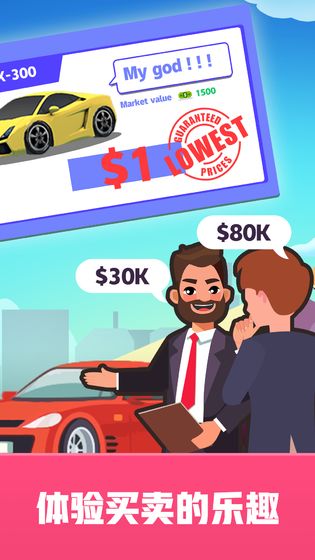 《二手车大亨》是一款非常有意思的放置类模拟经营游戏,玩法简单又带点策略性。游戏中,你扮演一个二手车商,主要任务是通过还价和购买来扩充自己的库存,然后雇佣销售顾问和代购员帮忙卖车赚钱。游戏画面采用3D卡通风格,看起来很舒服,而且操作也很直观,适合各个年龄段的玩家。