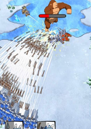远程攻击的选择,当然也是靠左面放,首选弓,占人口少、攻击高。其次是投石机,切忌用弩车,弩车有击退功能,一个击退,猩猩的攻击方向可能就会变,一个地图炮就能带所有远程走。