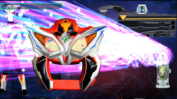 7、这样就算变身成功啦!不同的奥特胶囊还可以搭配在一起触发组合特效哦!最后扣动扳机按钮,还可以触发奥特战士的卡牌形态!