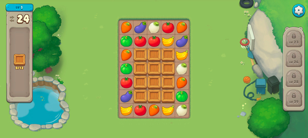 4、游戏采用三消玩法,玩家须通过消除相同的蔬菜水果来清理木箱;