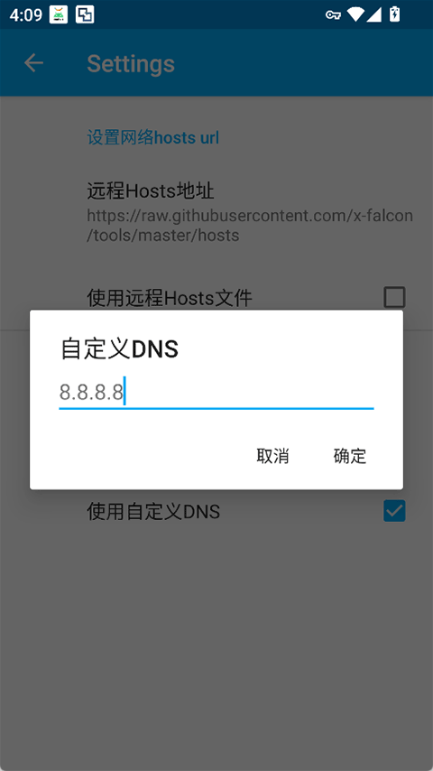 支持设置自定义 dns 服务器,默认使用 8.8.8.8