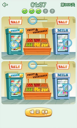 有大量的挑战关卡,关卡的难度会随着玩家的深入而逐渐变得困难,玩家需要更仔细地寻找。游戏采用卡通风格,让人感觉轻松有趣,不会太伤眼睛,轻松找到区别。