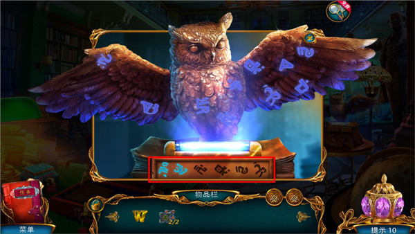 12、再次点击猫头鹰雕像将紫外线灯放生去,然后根据下面符文的指示点击相应的符文,得到金属羽毛。