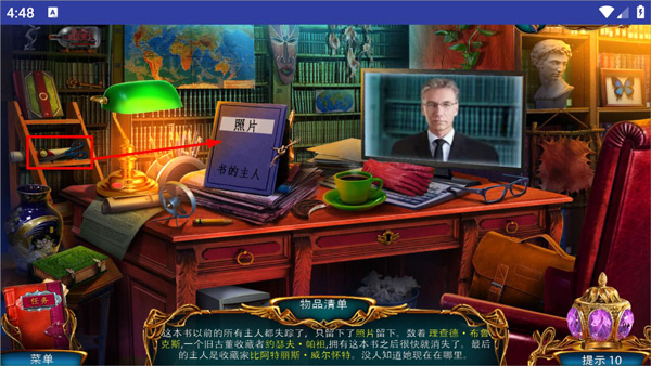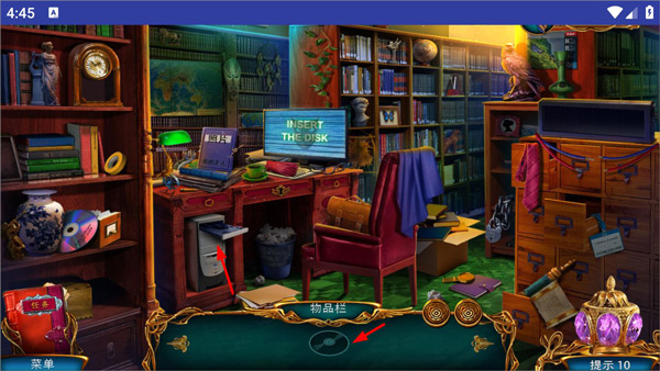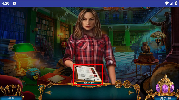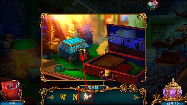 11、点击漂浮在中间的书,推出点击旁边的猫头鹰收集拼图嵌块,点击左手边红色布盖着的地球仪,打开获得紫外线灯还有拼图嵌块。