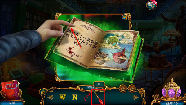15、将打火机燃油入到打火机当中,点击桌面,使用打火机燃烧锁,从中获得丝带还有箭,点击书本,使用箭戳伤手指。