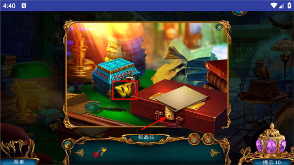 3、点击面前的桌子从上面拿到,黄金色W,再使用刚刚在妹妹处获得的钥匙,打开箱子获得任务书,一直翻开最后一页获得通行卡。