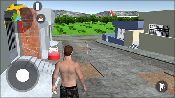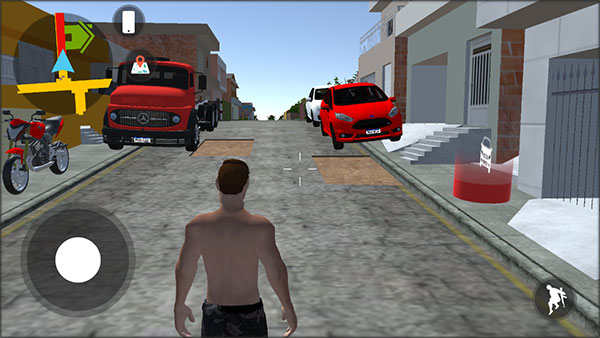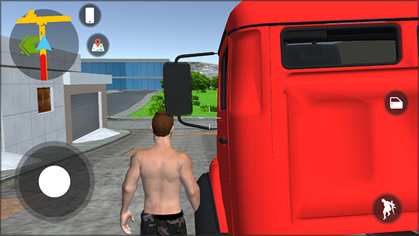 1、下载安装好低速汽车模拟器,进入游戏,首先通过使用左边的轮盘控制角色移动,右边控制角色跳跃,滑动手机屏幕控制视角。